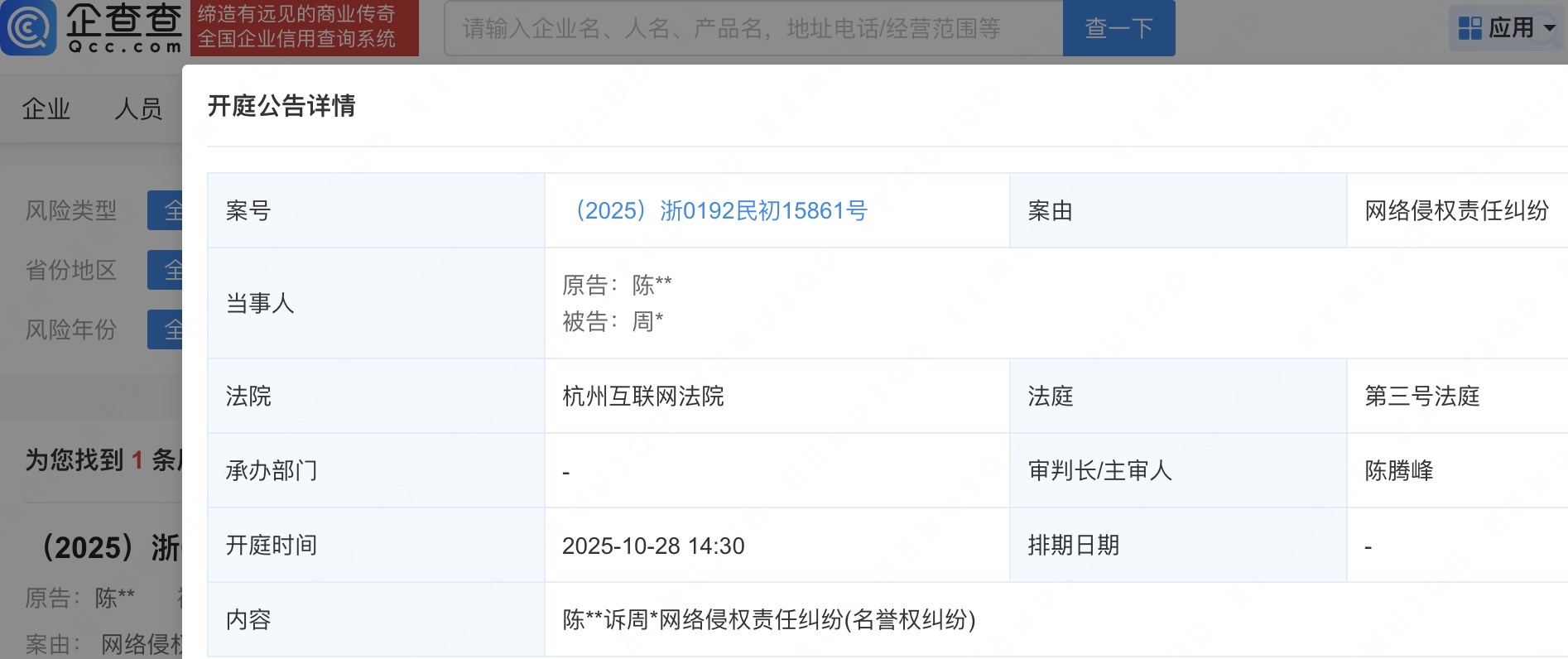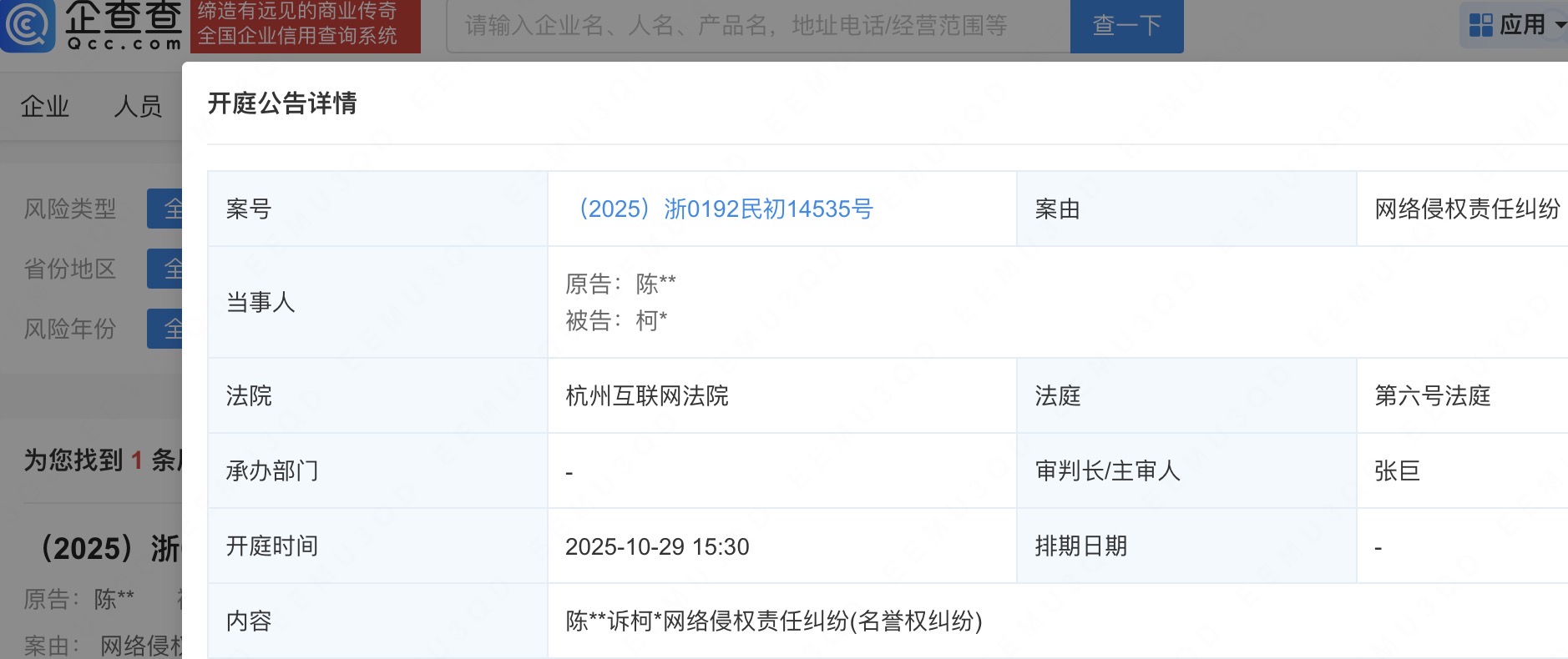 近日,杭州互联网法院向陈某公告送达陈丽君与其网络侵权责任纠纷案件起诉状及证据副本、开庭传票等诉讼文书天成创亿,自公告之日起满30日即视为送达,并定于11月11日开庭审理。此前,陈丽君曾多次发起维权诉讼,被告包括周某、柯某等,上述两案件已分别于10月28日、10月29日在杭州互联网法院开庭审理。