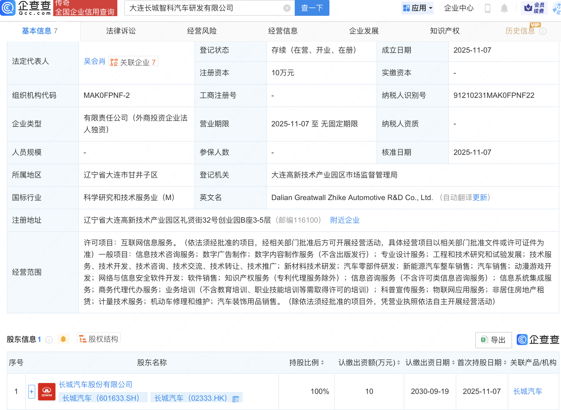近日,大连长城智科汽车研发有限公司成立,经营范围包含:新材料技术研发;汽车零部件研发;新能源汽车整车销售;汽车销售;动漫游戏开发等。企查查股权穿透显示世纪汇通,该公司由长城汽车(601633)全资持股。